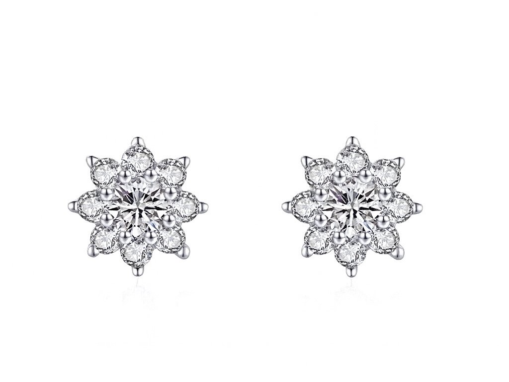Okolo stredového kameňa sú zasadené menšie kamienky, ktoré spolu vytvárajú efekt jemného kvetu alebo snehovej vločky. Celá náušnica má rozmer 8,6 mm , takže je dostatočne decentná na každodenné nosenie, no pritom upúta svojím žiarivým vzhľadom.