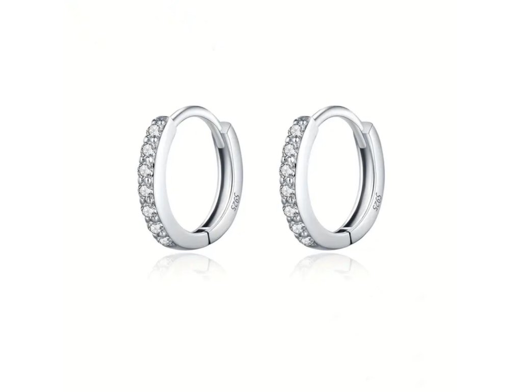 Elegantné kruhové náušnice s vonkajším priemerom 13 mm, osadené žiarivými moissanitmi s priemerom 1,4 mm a hmotnosťou 0,013 ct každý.