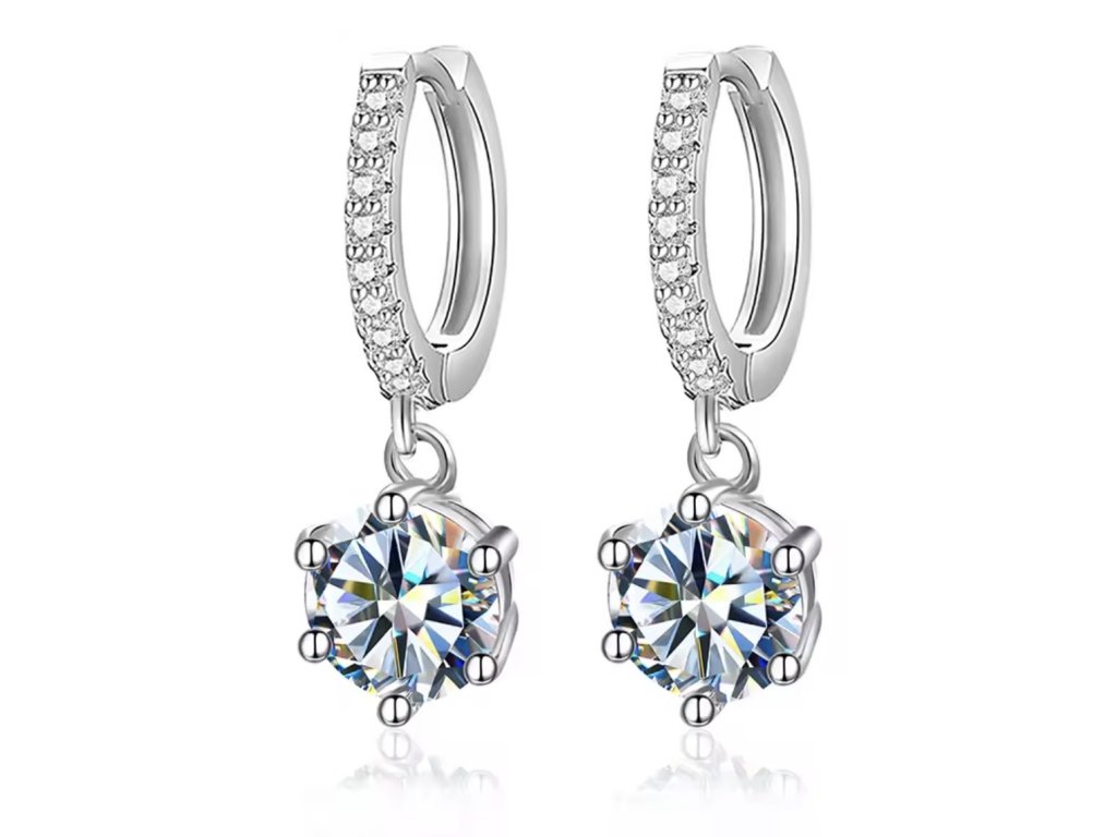 Jemné a elegantné visiace náušnice zdobené moissanitovým kameňom s priemerom 6,5 mm (1 ct).