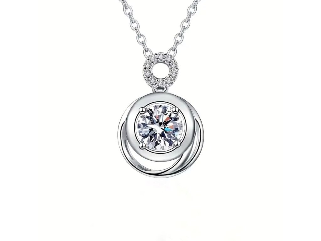 Náhrdelník so žiarivým moissanitom v brilantnom bruse. Dominantou je kameň s priemerom 6,5 mm (1 ct), čistotou VVS1 a farbou D, ktorý krásne odráža svetlo a pôsobí ako diamant. Okrúhly prívesok so zdobeným detailom dodáva šperku modernú eleganciu.