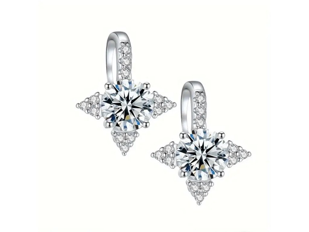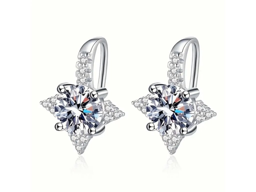 Elegantné náušnice s moissanitovým kameňom s priemerom približne 6,5 mm (1 ct), zasadeným do motívu hviezdy. Horná časť náušnice je doplnená drobnými čírymi kamienkami.