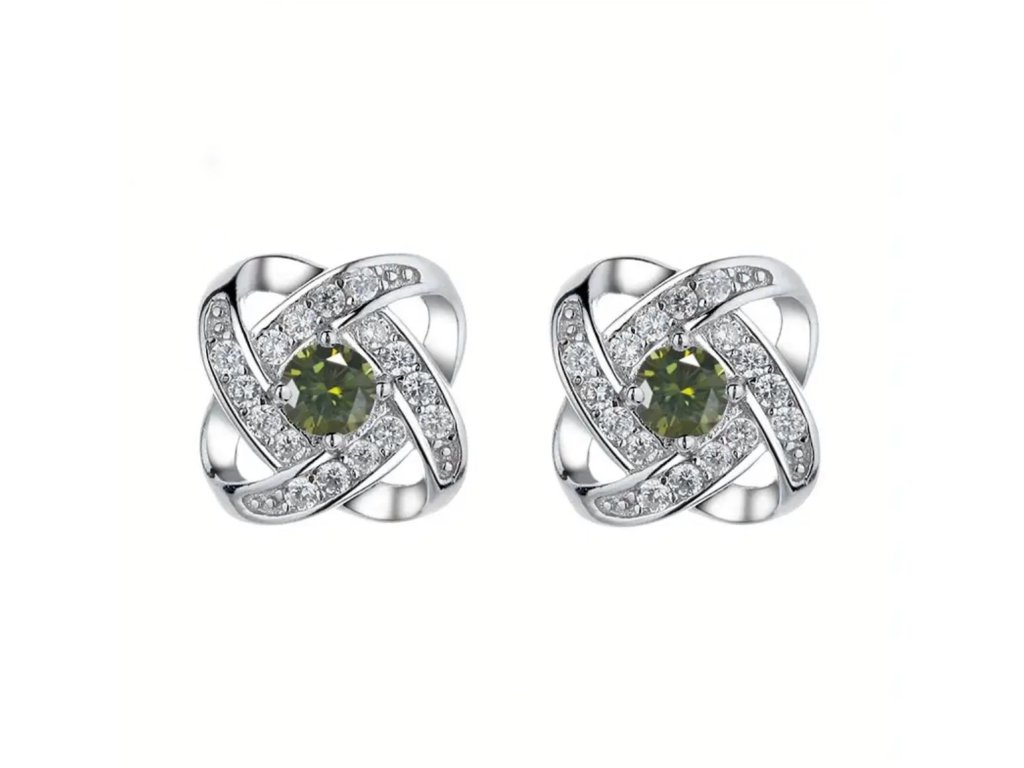 Elegantné náušnice zo zliatiny s centrálnym zeleným moissanitom. Prepletený dizajn so žiarivými kamienkami dodáva šperku luxusný vzhľad.